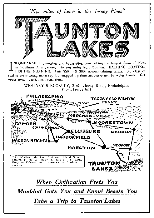 In the early 1920s Joseph Hinchmans scattered heirs sold out to Edward Murray, a Philadelphia businessman who hoped that the completion of the Delaware River Bridge in 1926 would ripen Taunton for development. He laid out lots, converted the bogs to lakes, and printed a flamboyant flyer headed: When Civilization Frets You, Mankind Gets You, and Ennui Besets You, Take a Trip to Taunton Lakes. Because of the depression and World War II development lagged; in 1947 the Murrays decided to sell. It was apparent to the residents that Taunton would eventually be attractive to other developers, and should they succeed in acquiring the property, the things that made Taunton such a desirable place to live would (to a large degree) be lost. Therefore, the Taunton Lakes Company was formed by the residents and through an elected committee successfully negotiated the purchase of Taunton Lake and the unsold lots around it. The Lakes Company continues to own the undeveloped land, and strives to keep Taunton a desirable place to live.