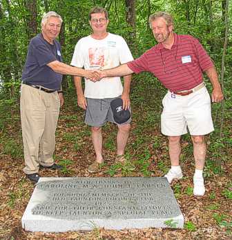 During the 2006 annual picnic, members of the OTCC board publicly thanked the Larsen family with a monument alongside the path. Top photo: OTCC board secretary Paul Lucas (right) thanks former board member Dick Watson (left) for his efforts as liaison with Carter Larsen in arranging for the gift and the monument, as Board president Marty Hamilton looks on. Bottom photo: the face of the monument. Shown below is the text of a letter from the OTCC board to Carter Larsen, thanking him for his generous gift. |