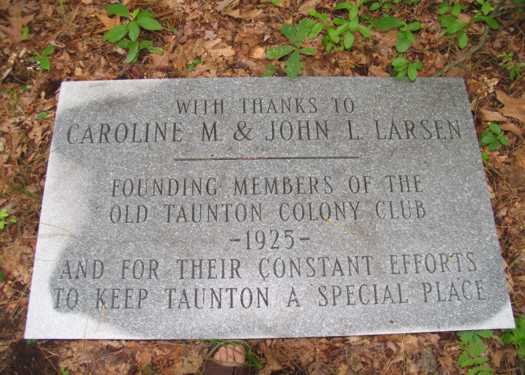 Dear Mr. and Mrs. Larsen, On behalf of the Board of Trustees and the membership of the Old Taunton Colony Club, we want to thank you for your generous gift to our community. For the past many years, the Board of Trustees has fought to keep the properties that adjoin our beautiful path that runs from West Lake Road to the beach from being developed. Aside from the aesthetics, it provides safe passage for our members, especially the young and the elderly, to the beach from the west side of the lake. For those of us who work hard year-round to protect and preserve the beauty of the lake and the surrounding community, your gift means a great deal. Your property was the last "piece of the puzzle" that we needed in order to assure an undisturbed future for the path that has been known for many years as "Lover's Lane". We find the monument that you so carefully chose, to be a very tasteful addition to the natural surroundings. Further, its sentiments remind all who stop to gaze, of the connection we all have to the natural world and how fortunate we are to be living at Taunton Lake. We will happily care for the monument and its surroundings, and will readily abide by the restrictions that accompanied your gracious gift. During our Annual Picnic, to be held on July 22, 2006, the Board of Trustees and other members of the community will take some time out to walk to the monument and hold a dedication ceremony. Thank you!