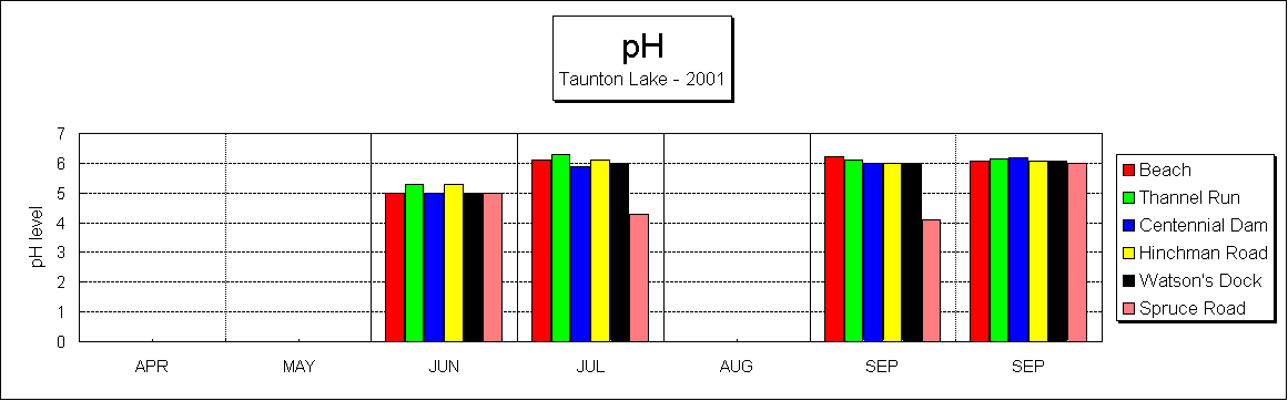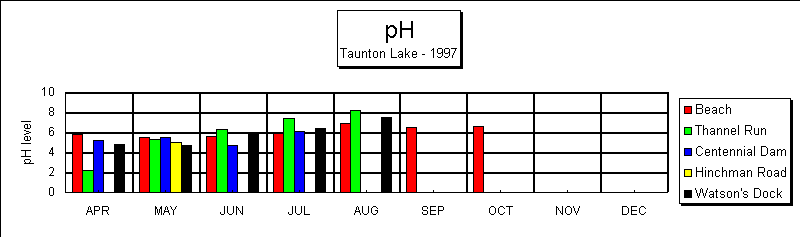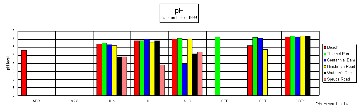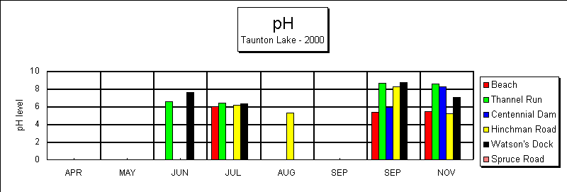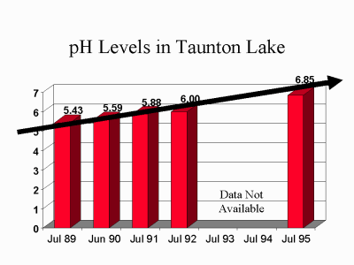 In 1995 a Water Quality Committee, composed of Taunton Lake residents, was formed to help inform and educate residents of Taunton Lake and surrounding communities about water quality issues affecting our lakes. In 1997, the committee began a program of periodically testing the lake water for pH (acidity/alkalinity), and harmful phosphates and nitrates. This testing continued through 2001, except for 1998.